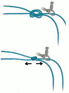 Installation de la corde : Vaché à un relais, on va donc installer d'abord la corde. Celle-ci peut être une corde spécifique de rappel, de diamètre plus fin (8 à 9mm contre 9 à 11mm pour des cordes dites à simple). Une corde de rappel se présente soit en un seul brin (100m), ou deux brins de 50m. Dans le premier cas, on fait passer entièrement un brin de la corde dans le maillon, dans le deuxième on l'insère de 30cm, de quoi rabouter les cordes avec un noeud simple.